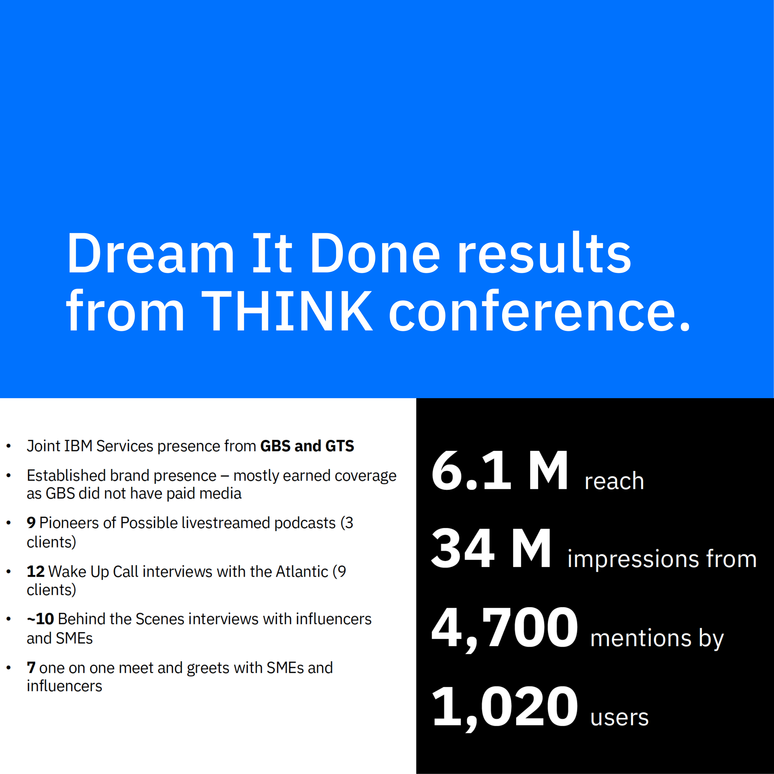 Enter "Dream It Done"—our bold omnichannel campaign that redefined IBM Services. Launched at the electrifying THINK conference, this initiative illuminated how IBM empowers visionary leaders to transform dreams into reality. We amplified the message through "The Wake-Up Call," a gripping editorial series in partnership with Atlantic Magazine, showcasing the trailblazing C-suite clients who are not just keeping pace but leading the charge in digital transformation.